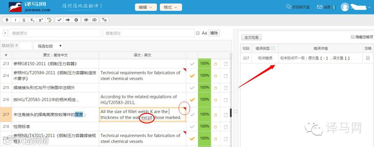 Tip:如果QA显示某句格式错误,可双击或拖动选择该句译文,鼠标点击对应的原文,最后按enter键保存译文就可以将原文格式轻松复制到译文。
