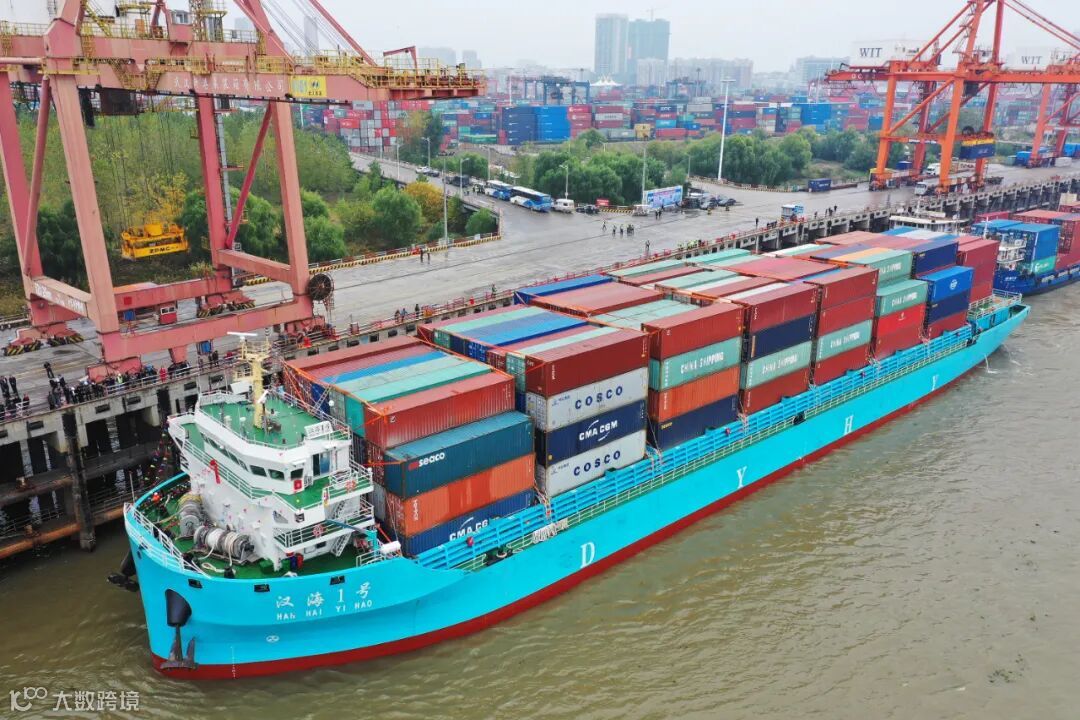 可装载1000标箱的蓝色货轮“汉海5号”,是眼下航行于我国内河上最先进、 装载量最大的江海直达集装箱船。“汉海5号” 的加盟,标志着武汉江海直达航线上首次有了千箱级货轮。