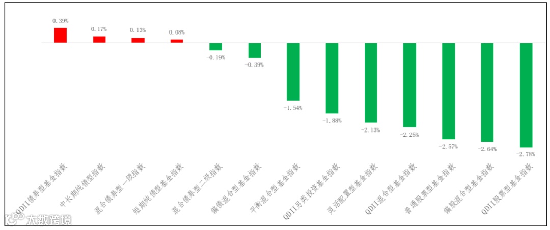 基金指数方面,主动权益类基金指数整体回落,平衡混合型基金指数跌幅为1.54%,QDII股票型基金指数跌幅为2.78%。固定收益类基金指数中,中长期纯债型指数涨幅为0.17%,偏债混合型基金指数跌幅为0.39%。
