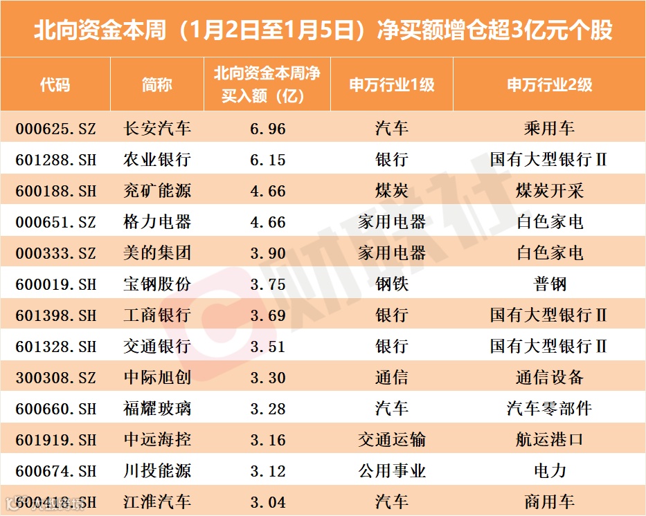 从周度(1月2日至1月5日)表现看,北向资金周净买额累计超3亿元的个股见下表。其中,长安汽车净买入额近7亿元。来自银行板块的农业银行、工商银行、交通银行加仓额分别为6.15亿元、3.69亿元、3.51亿元。