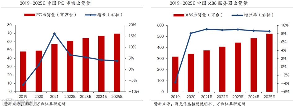 在PC、服务器领域,X86架构占据主导地位,Intel、AMD两大代表厂商占PC市场份额合计达90%以上,尽管近年来适配国产CPU的PC产品发展迅速,但总体份额仍不足5%。依据IDC预测的2022-2025年X86服务器出货量,并参照2020年路数分布比例,测算到2025年我国服务器CPU需求量至少达1066万颗,未来三年复合增速约9%,加之PC市场一台PC配置一颗CPU的需求,预测2025年整体CPU市场空间在8000万颗以上。