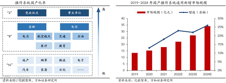 国产操作系统在党政、金融、交通、能源、电信等多个行业涌现出应用落地的实例,并逐渐向核心业务领域渗透。目前,操作系统在党政的国产化率明显高于行业,行业中金融和电信的国产化率逐步提升。根据相关测算,未来几年国产操作系统在除军工和涉密行业以外的“2+8+N”市场增速将超过20%。
