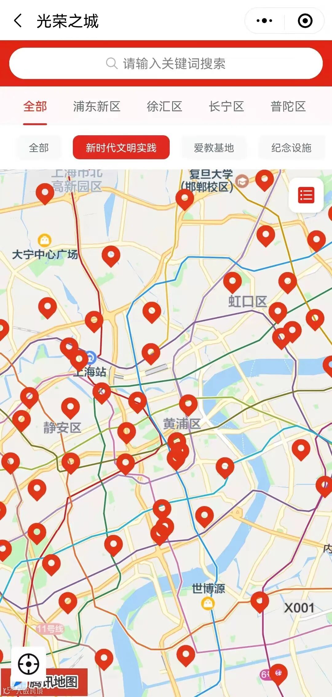 小程序上线后,“光荣之城”红色地图内容也再度升级。在集合526处革命遗址旧址和爱国主义教育基地场馆的基础上,“红途”持续整合优质资源,联合市精神文明办,推动全市16个区级新时代文明实践中心和221个乡镇(街道)级新时代文明实践分中心入驻,进一步做到红色信息“一屏尽览”,资源分布“一览无遗”。新时代文明实践中心入驻“红途”,实现了优质资源的互通互享,形成强大合力,大大提升红色文化传播声量。