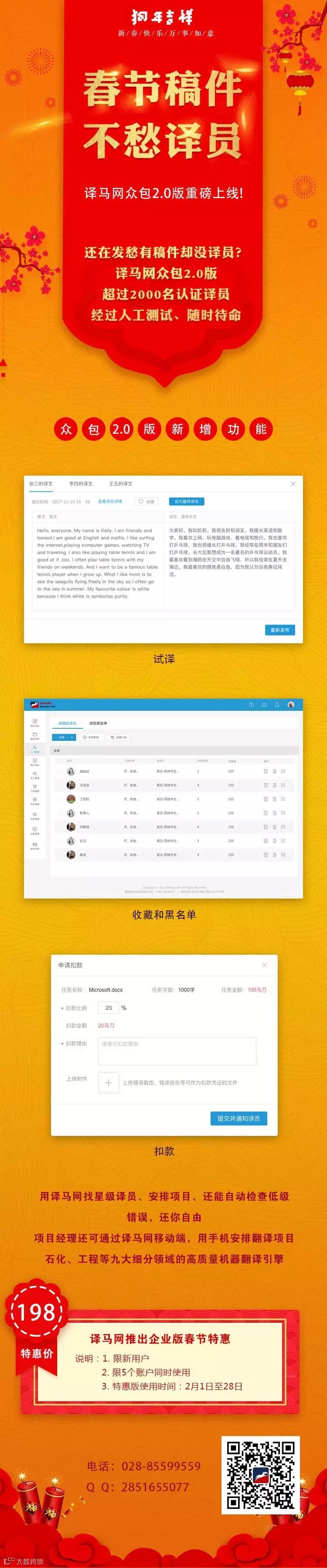 导读:春节接稿,不愁译员不够,译马网众包2.0,超过2000名人工审核认证译员随时待命,移动端也可以一键派单,还有细分领域机器翻译。