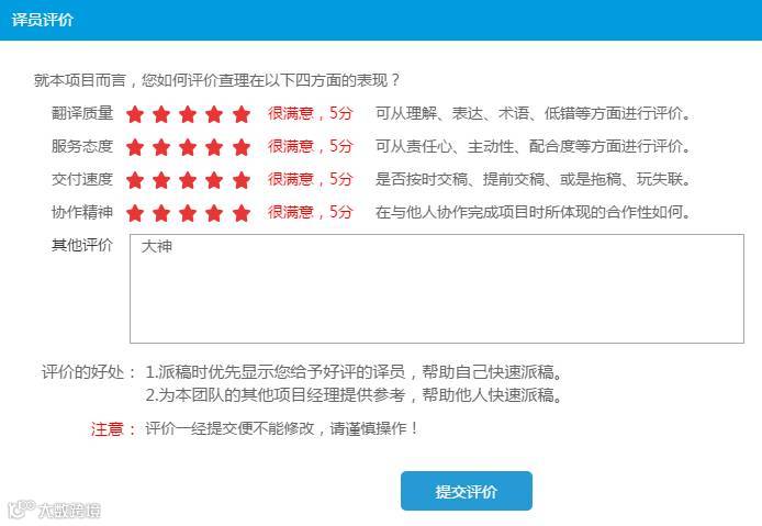 在译员完成翻译项目后,项目经理可对译员进行评价,评价结果将影响译员的信誉值。