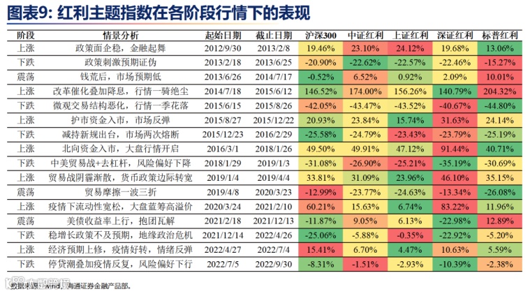 2.市场表现:统计近十年常见指数的表现可以看到,红利指数长期业绩较好,在低利率环境、震荡市场、市场情绪偏弱、宏观经济下行周期、资产荒背景和价值风格偏强等多种市场环境下其均有较好表现,并且在牛市环境下依旧稳定。