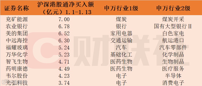 据Choice数据统计,1月1日至1月13日期间,北向资金累计净买入额前十位个股分别为兖矿能源、农业银行、美的集团、中远海控、福耀玻璃、万华化学、智飞生物、药明康德、韦尔股份和光弘科技,净买入额均超3亿元。北向资金本月累计净卖出额前十位个股分别为贵州茅台、隆基绿能、宁德时代、赣锋锂业、紫金矿业、分众传媒、东方财富、五粮液、中国平安和中国石油,净卖出额均超4亿元,详细情况见下表: