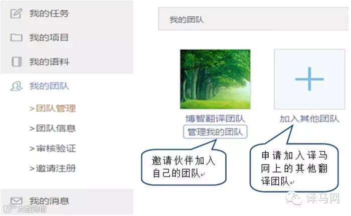 选择“我的团队”->>“团队管理”点击“管理我的团队”按钮,邀请伙伴加入自己的团队;点击“加入其他团队”按钮,查找并申请加入其他团队。
