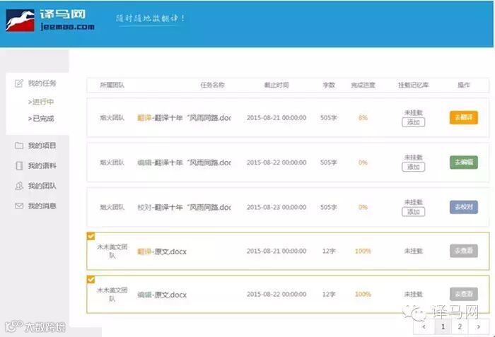 显示您参与的翻译任务的详细信息。包括自建的翻译项目,以及您加入的其他团队分配给您的翻译任务。