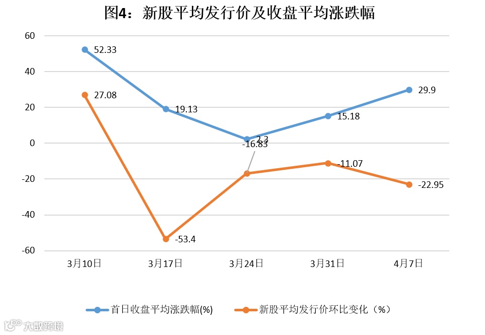 本周新股平均发行价为33.48元,环比下降22.95%,与2023年3月平均水平(33.51元)基本持平。新股首日收盘平均涨跌幅(周)为29.9%,环比上涨14.72%,新股首日赚钱效应整体有所回升。