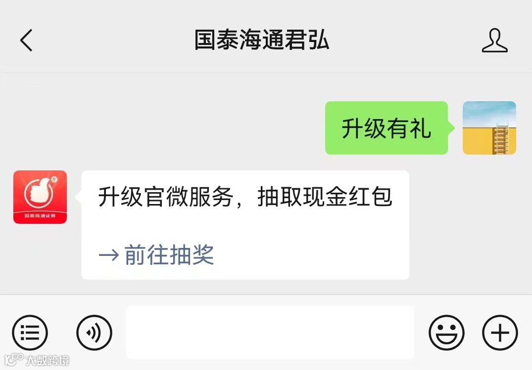 2、参与规则:活动期间,符合条件的受邀用户(注:受邀用户是指活动开始前已成为“国泰海通君弘智投服务号”用户,且在活动期间首次成为“国泰海通君弘服务号”用户),发送“升级有礼”至国泰海通君弘服务号(账号ID:GTHTJHFWH)后台,即可获取抽奖链接,并获得1次抽奖机会;完成资金账户绑定的用户,可增加1次抽奖机会。链接仅限本人参加,转发无效。活动期间每用户至多有2次抽奖机会。