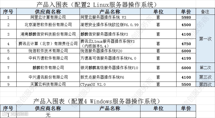 上周,国采中心公布开放式框架协议采购的操作系统第四次产品入围结果。本次新增一项服务器操作系统,结合以往入围结果,整合在一起:如下
