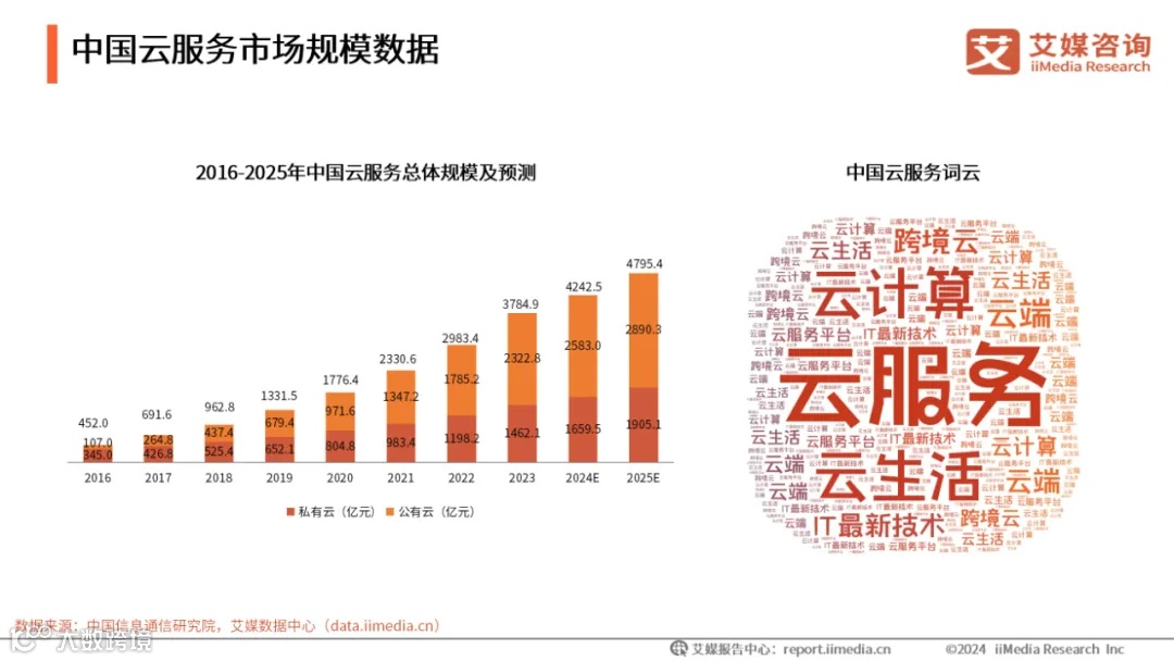 数据显示,2023年中国云服务规模达3784.9亿元,随着数字经济时代到来,各领域对信息技术软硬件依赖程度不断加深,为云服务行业发展提供良好的基础。在国家政策不断加持下,数字化转型为云服务行业带来发展契机,2025年中国云服务规模有望达4795.4亿元。