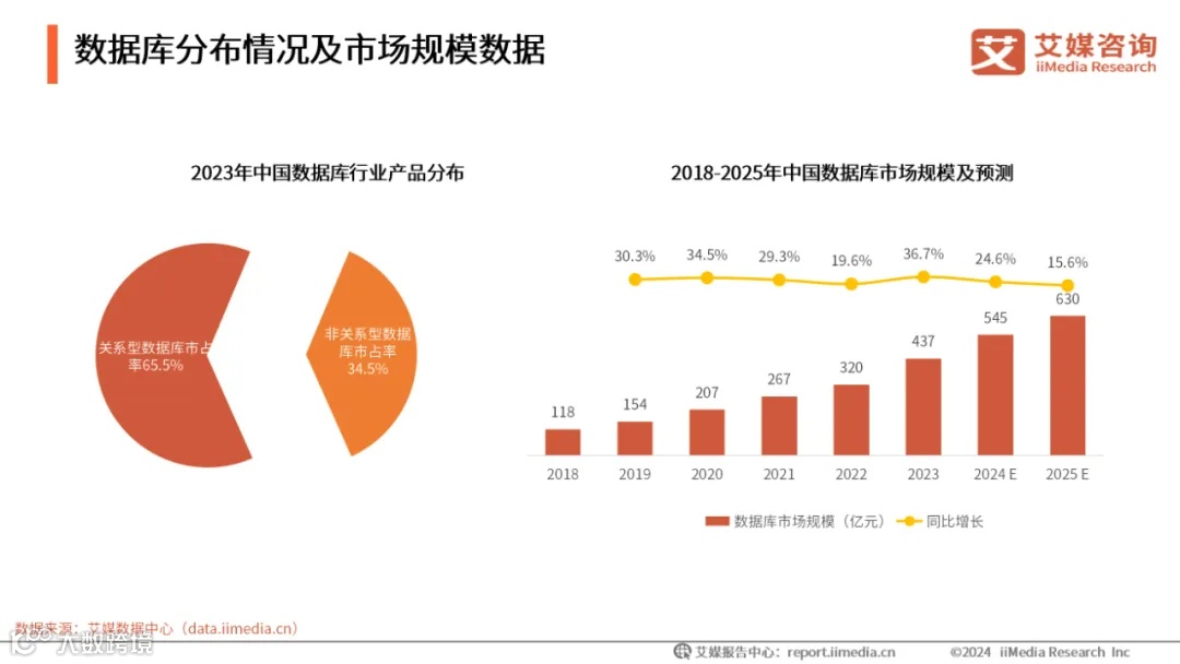 数据显示,2023年中国数据库行业市场规模为437亿元。随着国内数字化转型节奏加快以及国产替代浪潮涌动,基础软件领域迎来了高速发展,数据库作为信息系统核心软件以及信创的关键环节,迎来产业黄金期。中国数据库行业市场规模将持续上升,预计2025年有望达630亿元。