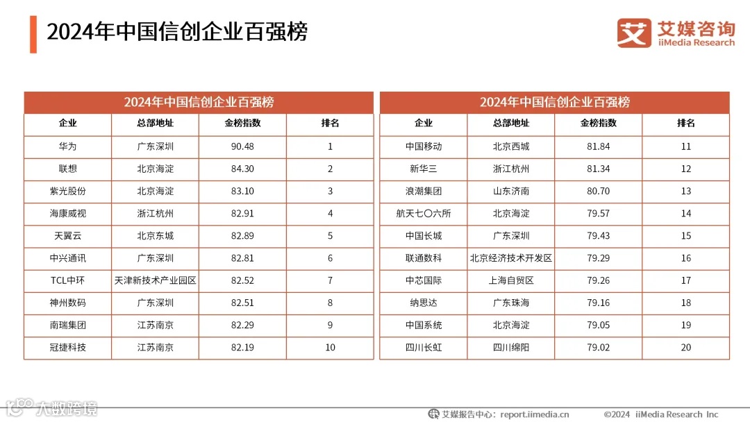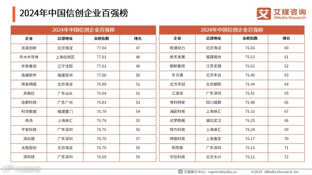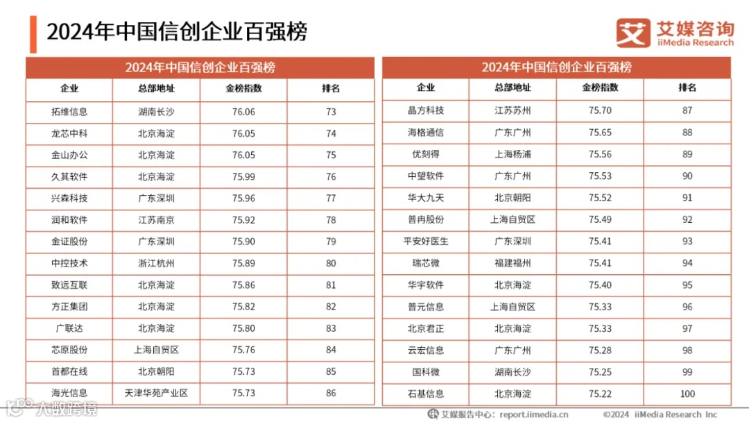 全球新经济产业第三方数据挖掘和分析机构iiMedia Research(艾媒咨询)最新发布《2024年中国信创企业百强榜》,此榜单依托艾媒自主研发的“中国CMDAS大数据挖掘与分析系统”(广东省重大科技专项,项目编号:2016B010110001),采用iiMeval大数据评价模型计算赋值,监测期内根据企业基础实力、企业规模、产品与研发、媒体传播、分析师团队评价等指标进行分析核算生成,侧重信创企业营收评价因子。指标分数范围为0-100分,分数越高则表示企业以及产品在所存在领域综合实力越强。