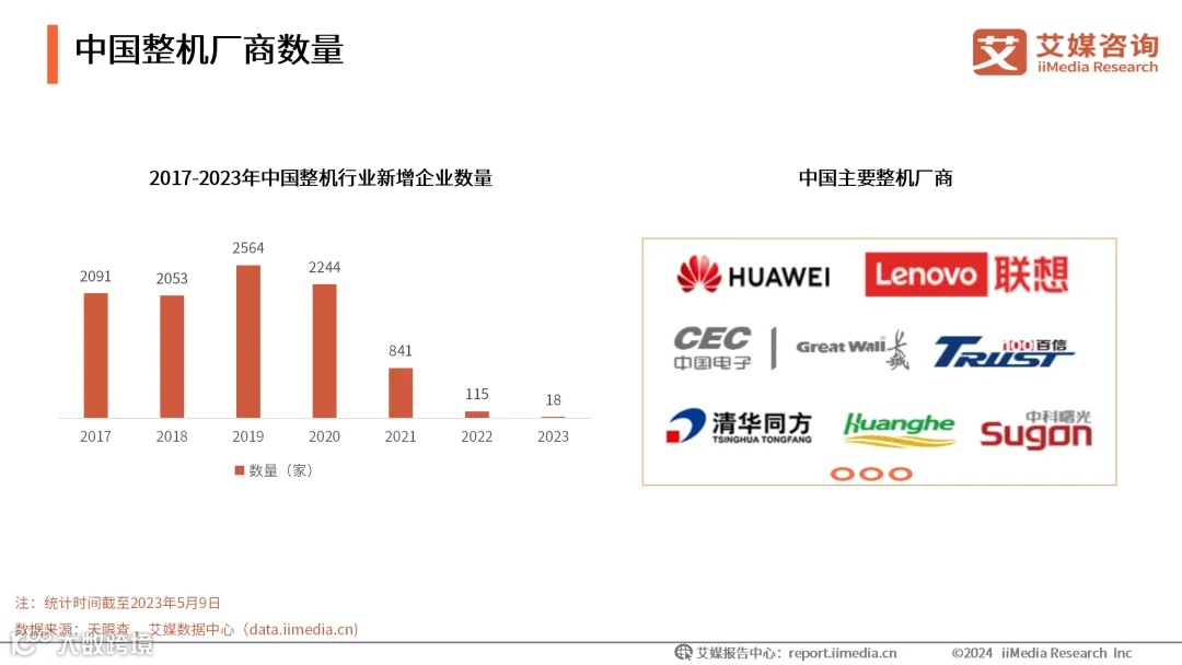 数据显示,2017-2020年,中国整机行业蓬勃发展,新增企业皆超2000家;整机厂商逐年增多,截至2023年5月9日,中国整机行业累计企业数量23948家。国内信创整机厂商主要有长城、华为、联想、中科曙光、清华同方等,面对信创市场趋势,各品牌不断提升自身产品能力,以期创建更广阔的整机服务生态。