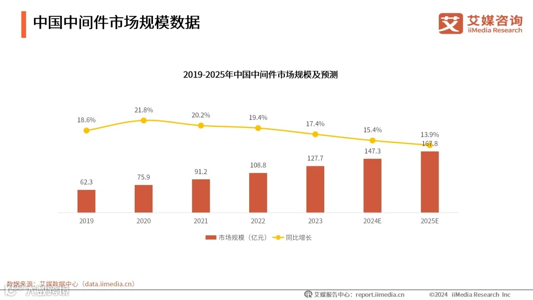 愈多企业在数字化转型背景下意识到软件基础设施的重要性,中间件市场在中国蓬勃发展。iiMedia Research(艾媒咨询)数据显示,2023年中国中间件市场规模为127.7亿元,同比增长17.4%,2025年将达167.8亿元。随着国产中间件厂商技术的升级,国产中间件头部厂商逐渐赶超国外厂商,在电信、金融、政府、军工、能源、医疗等行业客户中不断打破原有海外中间件厂商的垄断,逐步实现中间件软件产品的国产化自主可控。