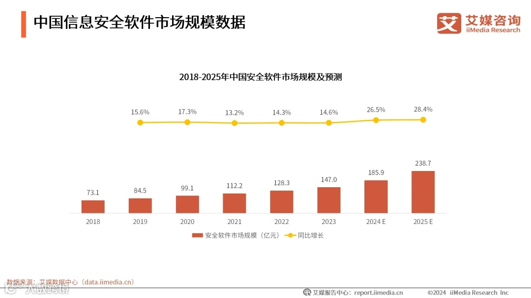 数据显示,2023年中国信息安全软件行业市场规模达147.0亿元。艾媒咨询分析师认为,政企组织对安全软件的需求逐步扩大,安全软件的需求逐步向商业客户扩大,企业在安全服务方面的预算有望大幅提升,进一步促进信息安全软件市场的增长。
