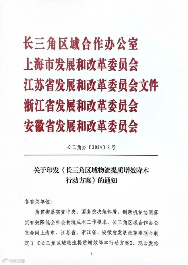 为贯彻落实党中央、国务院决策部署,创新机制协同落实国家层面有效降低全社会物流成本工作要求,推动降低长三角区域物流成本、提高经济运行效率,长三角区域合作办公室、上海市发展改革委、江苏省发展改革委、浙江省发展改革委、安徽省发展改革委联合印发《长三角区域物流提质增效降本行动方案》,明确了7方面37项具体举措。