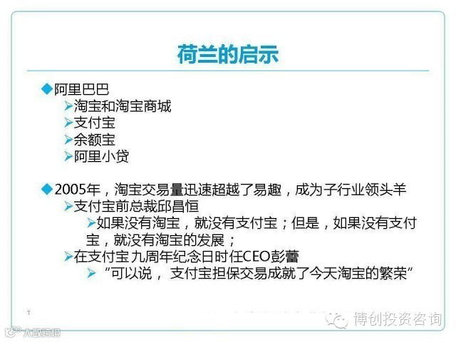 300多年后,有一个公司叫阿里巴巴,它做了淘宝和淘宝商城,它做的是天上的贸易不是海上的贸易,它为了做天上的贸易需要天上的金融去支持它,为了做这个事情它被迫去做支付宝。它一开始是做支付宝,由于支付宝和贸易的结合,淘宝成为了今天的电商,全世界最大的领先的电商。今天阿里巴巴之所以能够去美国去上市及有着2000多亿美金的估值,这和支付宝是完全分不开的。当你做了支付,就像阿姆斯特丹一样,慢慢就会做各种信贷、投资产品,比如说余额宝,比如说阿里小贷,所以商业和金融的逻辑是不变的。