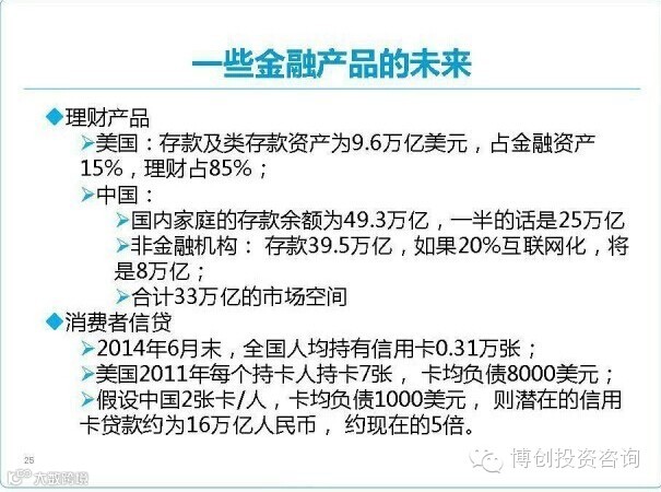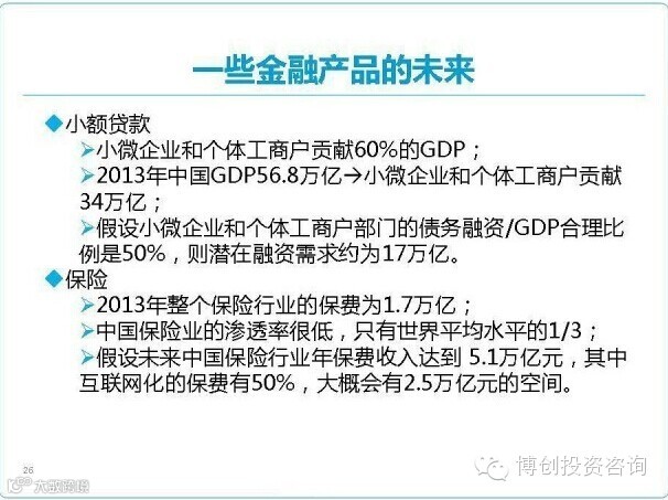 那么我借用两分钟讲一下一些金融产品的未来前景。如果你看一下,你会发现美国人的金融资产大概只有15%的钱放在银行里,中国可能倒过来,85%的钱放在银行里。如果一般家庭的存款会有一半从银行里跑出来,如果非金融机构、企业在银行里的存款能有20%的互联网化的话,加起来就是三四十万亿的这样一个市场的空间,所以理财,包括互联网理财是一个非常大的一个方向。我刚才提到的消费者信贷,那么中国现在人均持有信用卡大概是0.3张,美国的话,就是每个持卡人大概有7张,如果中国每个持卡人大概能有人均2张的话,大概5、6倍的涨幅了,那么就是有十几万亿的规模的消费者信贷这样一个市场没有被开发的。再看一下这个小微企业和个体户对中国GDP贡献大概是60%这样一个份额,所以你看一下13年底的GDP的话,它们的贡献大概有34万亿的这样一个份额。但我们知道中国这样小微企业和个体户基本在银行里是借不到钱的,所以这是一个待开发的市场。但是你要去开发他的话一定是需要大数据的支持,那么在这个时代是经济的革命就会带来这样一个便利。还有保险,那么我就不多说了。
