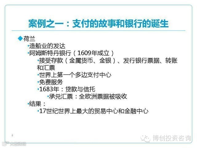 第一个现代意义上的银行是阿姆斯特丹银行,它是在1609年诞生的。为什么会有这样一个银行?因为哥伦布航海带来了远洋贸易的商业需求,而荷兰因为造船、物流比较厉害,许多的货物会通过阿姆斯特丹进入欧洲。有了这样一个商业和贸易的需求,它就需要金融去支持。第一个金融的需求是什么呢?是支付和结算。所以阿姆斯特丹银行在1609年就成立了,这个银行只做一件事情,就是支付和结算,它接受各个国家的金属、货币和金银,同时它发放银行的票据、转账、开汇票。这是全世界第一个结算和支付的多边中心,这个中心就只做一件事情就是支付,一直做了70多年。