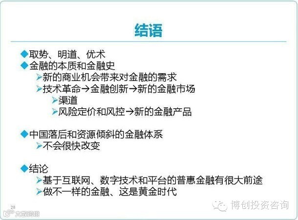 我刚才已经从金融的本质和金融史的角度讲了一下,那么我想讲的还是这三个点,金融的本质。第一个是新商业的机会将带来对金融的需求,就像互联网时代带来的新商业机会也会带来新的对金融的需求,那么技术革命它往往会带来金融创新,带来新的金融市场。就像我们当年无法想象的消费者信贷一样,我们可能也无法想象一个新的金融市场的革命。由技术革命带来的金融市场的产生,这个技术革命可以带来渠道的革命,也可以由于对信息的大数据收集而带来征信,带来新的金融产品。所以中国的互联网,尤其是由商业平台的互联网,这个平台因为它有了渠道和大数据,它能带来很多的金融创新,所以在这样一个创新的基础上,基于互联网,基于数字技术和平台的普惠金融,我认为,它会有一个非常大的前途。大家想象一下,中国一般的老百姓都不知道买什么样的一个投资产品,在中国无数的中小企业和一般的消费者,他需要信贷,也没有这样一个金融工具的提供,所以在这个时代我觉得做不一样的金融,就是互联网金融,我觉得这是一个黄金的时代。那么我们长江的校训,来自我们项院长的“取势、明道、优术”。我刚才的发言其实就像是“取势”,如果我们是没有翅膀的猪,想飞翔的话最好的办法就是知道风口在什么地方,然后就是到这样一个风口去。这就是我今天想和大家分享的对互联网不一样的金融的理解,谢谢大家!