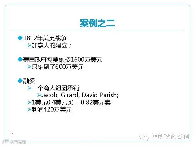 刚才讲的是银行的诞生,我再讲一下投行的诞生。美国在18世纪建立以后,过了20多年,在1812年跟英国打仗(这个战争可以说推动了加拿大的建立)。当时美国打仗需要钱,自己需要1600万美金,但是只能够融到600万美金。美国就像中国唐朝的居民龙会努一样没有渠道,不知道找谁去借钱,也没有很好的征信的记录。在这样的背景下,当时有三个纽约和费城的商人他们就说,好吧,我们来帮你做这件事情。于是,“承销”这个词就第一次出现了。这三个商人说,美国政府你可以发一个债券,1块钱美金的债券呢,我以4毛钱美金买进,然后他们转身8毛2就卖出去了。所以第一笔的承销费用美国政府1000万美金的面值只融到了400万的美金,而这个承销费用是420万的美金,所以美国当时和龙会努一样,面对的是高利贷,是因为他没有征信没有渠道,这个是第一个例子。这个例子告诉我们投行的本质。大家都看到了,什么是投行呢,投行就是承销不定性的金融的产品,能够有渠道进行这样的担保,这就是投行的主题。