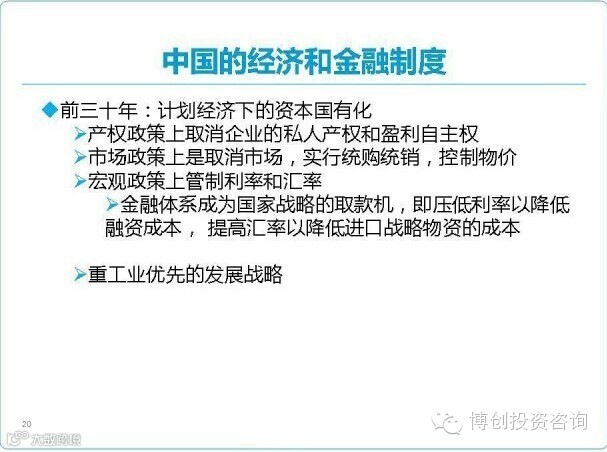 我们刚才讲的是从金融的本质以及金融史的角度出发来看这个不一样的金融的未来。我现在想从中国的经济金融制度来看这个未来。那么大家都知道,中国这个几十年经济就是资本的国有化,就是所谓的计划经济。计划经济,它当年就是取消市场,取消企业私人的产权,在宏观的政策上是管制利率和汇率,那么管制利率和汇率就是让中国所有的资本和资源都向中国的国有资本倾斜,是去支持中国重工业发展这样一个前景。当然,这样一个机制是非常糟糕的,它最后的结果是让中国成为消费短缺的经济体,城乡差距很大,因为它剥削农业。在金融体系里面,中小企业融资难,金融消费者找不到融资产品的这样一个现象。这是过去几十年,建国以来一直如此,那么到现在,依然是这样的。整个中国市场的金融体系,还是向中国的国有资本去倾斜的,而且它也不会非常快地去改变的。