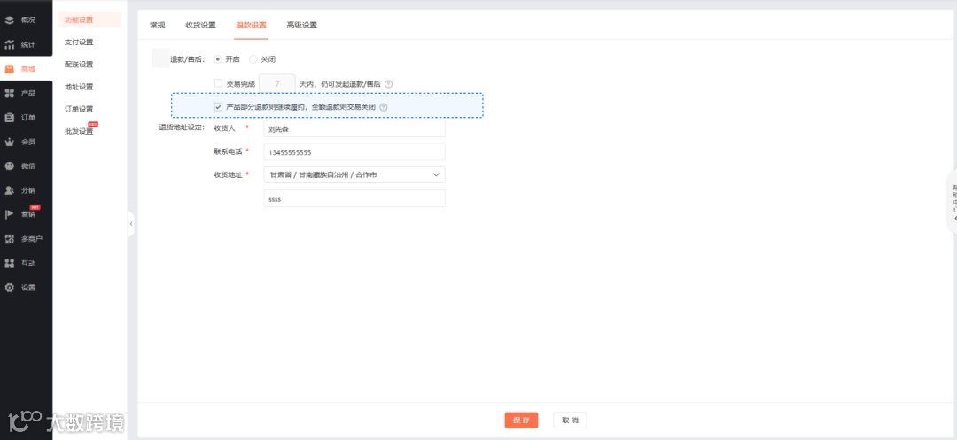 前往商家后台【商城-功能设置-退款设置】,启用【产品部分退款则继续履约,全额退款则交易关闭】