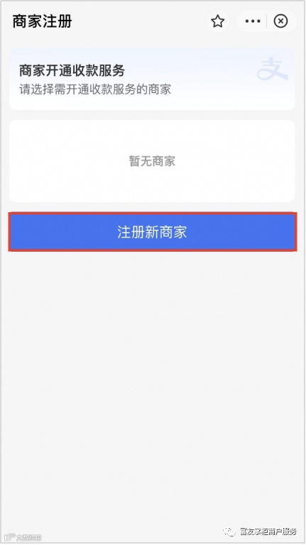 1)联系人或法人扫描“服务商拓展码”后进入注册页面,点击“注册新商家”进入认证页面;