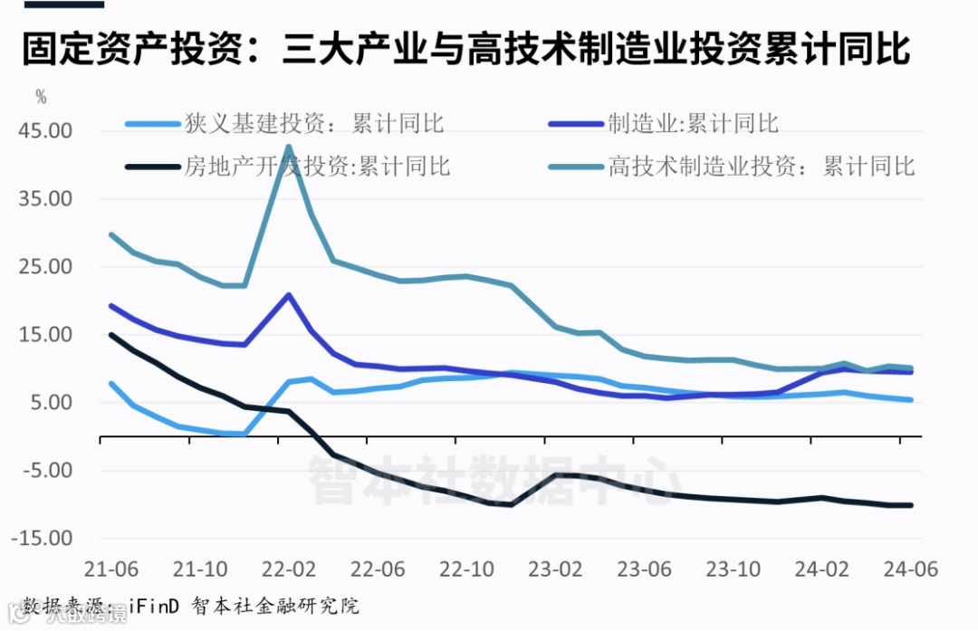 数据显示,今年上半年,在固定资产投资中,制造业投资增长9.5%,远高于房地产(-10.1%)和基建投资(5.4%)。在制造业中,高技术制造业投资同比增长10.1%。其中,航空、航天器及设备制造业投资增长38.3%,计算机及办公设备制造业投资增长12.1%,电子及通信设备制造业投资增长9.9%。另外,高技术服务业投资同比增长11.7%。其中,电子商务服务业投资增长24.1%,科技成果转化服务业投资增长17.4%,研发与设计服务业投资增长14.4%。