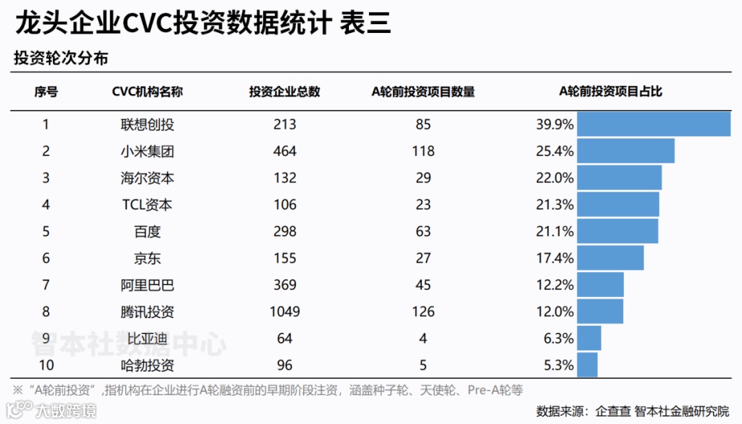 基于以上优势,这类主链型龙头企业CVC更可能做到“投早投小”。我还整理了一份“投早投小”清单:龙头企业CVC投资轮次分布数据(表三)。