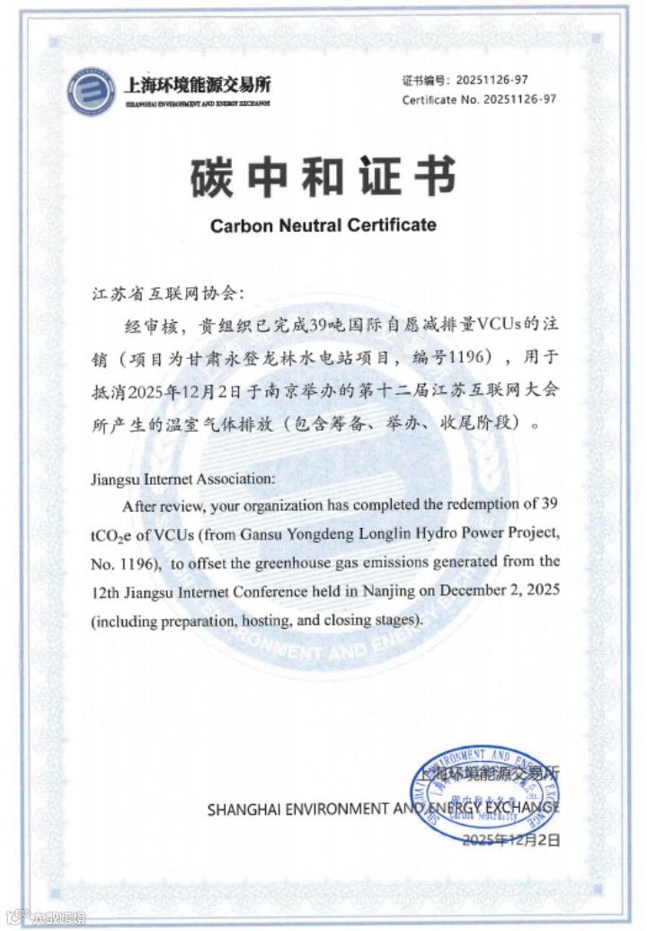 大会举办前,上海环交所与江苏省互联网协会工作组、碳管理体系(南京)服务中心紧密协作,将低碳理念融入大会的筹备、举办、收尾等各阶段,实现碳排放源头控制与过程减排。针对无法完全消除的碳排放,碳管理体系(南京)服务中心向赛事主办方捐赠了39吨国际自愿减排量(VCUs)用于抵消。经上海环交所专业审核与评估,大会实现了“可测量-可减排-可抵消”的碳中和闭环。上海环交所在AI+空间治理分论坛上向江苏省互联网协会颁发碳中和证书。