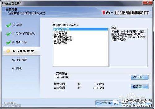 5.安装类型界面中选择所要的安装类型(安装全部产品、单机版安装、服务器安装、数据服务器安装、应用服务器安装、应用客户端),并可选择安装路径