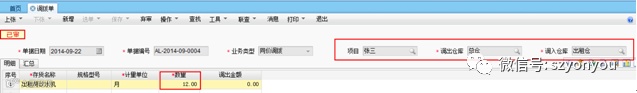 (2)填制一张调拨单,比如张三租用饮水机12个月,项目选择“张三”,数量填写“12”从总仓调到出租仓: