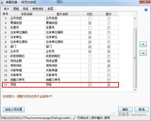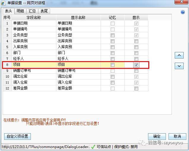(1)依次点击“库存核算”-“库存单据”-“调拨单”按钮,在调拨单上,点击“操作”-“设置”按钮,找到“项目”字段,勾选“显示”: