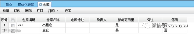 3、依次点击“基础设置”-“常用信息设置”-“仓库”,点击“新增”按钮,在仓库档案中建立两个仓库“总仓”和“出租仓”: