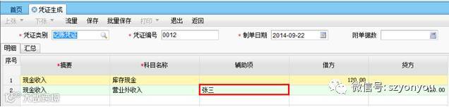 (2)填制一张收入单,业务类型为“现金收入”,项目为“张三”,出租收入为120: