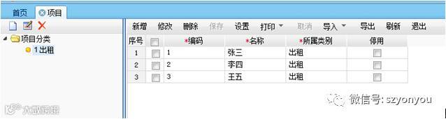 依次点击“基础设置”-“常用信息设置”-“项目”按钮,新增项目分类为“出租”,在出租项目下新增项目为出租对象: