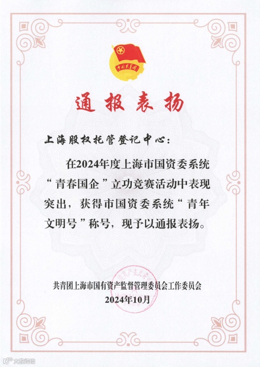 近日,上海市国资委系统2024年度“青春国企”立功竞赛先进集体和个人名单揭晓,上海股权托管交易中心全资子公司上海股权托管登记中心荣获“市国资委系统青年文明号”。