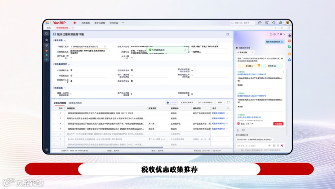 更贴心的是,AI 还能通过精准的纳税人画像,实时推送最适配的税收政策。无论是增值税优惠还是企业所得税减免,只要企业符合条件,AI 都会第一时间提醒,让企业的优惠应享尽享,避免因错过政策而造成损失。