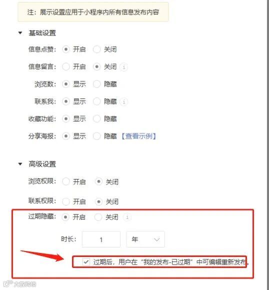 2)针对单个已发布信息,可以再单独开启设置单独的信息过期隐藏时间,或关闭,即始终不隐藏。