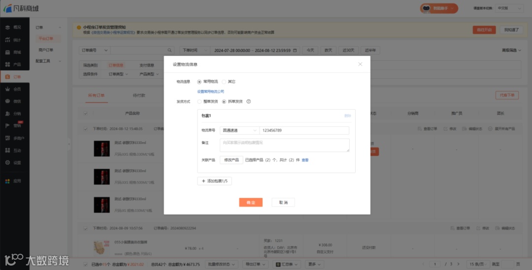 前往商家后台【订单-订单管理】,对订单进行拆单发货,无需选择处于【退款中】、【退款完成】的产品即可流转订单状态