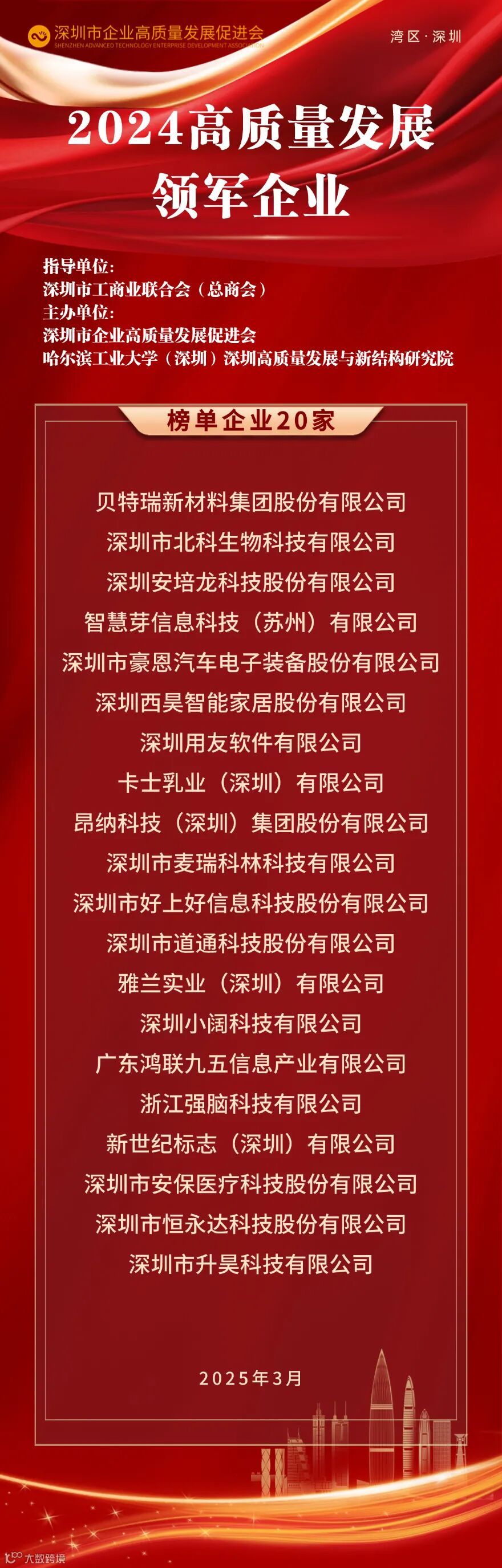 该项榜单由深圳市工商业联合会(总商会)指导、深圳市企业高质量发展促进会联合哈尔滨工业大学(深圳)深圳高质量发展与新结构研究院评选发布,旨在以科学研究、精准分析和高效服务来洞悉深圳发展新技术、新产业、新模式,发掘企业发展创新力、竞争力、可持续发展力,助力深圳企业加快形成新质生产力、增强发展新动能,进一步推动深圳企业在高质量发展道路上行稳致远。