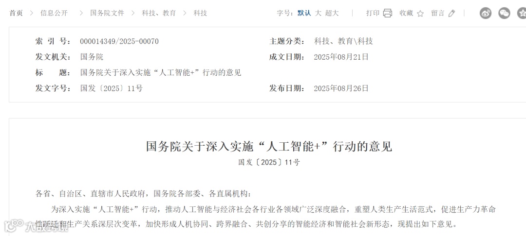 国务院日前印发《关于深入实施“人工智能+”行动的意见》,推动人工智能与经济社会各行业各领域广泛深度融合。