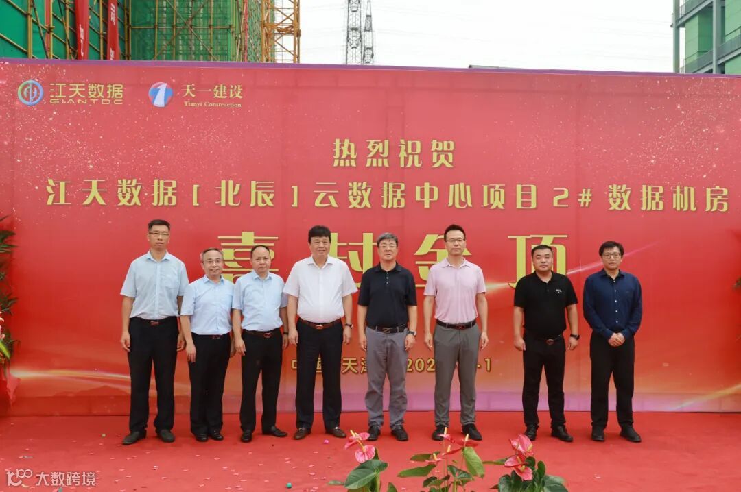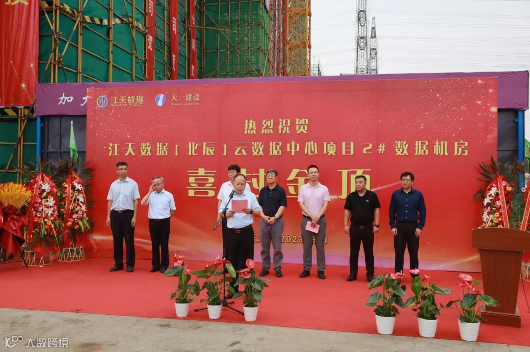 江天数据董事长赵江斌、总经理张健、采购部部长赵凤展、建设部部长马宁,天一建设董事长郭中朝、副总裁郭蔚飞、副总裁陈涛、总工程师王博等近百人出席封顶仪式。