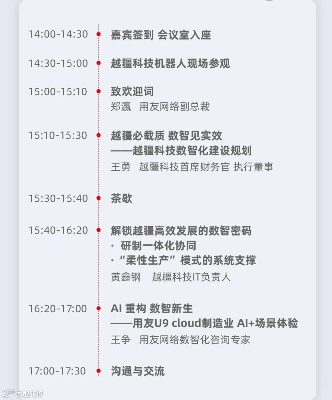 欢迎您参加“用友U9 cloud越疆科技数智先锋体验会”活动,本次活动将于4月18日(周五)14:00-17:30参观越疆科技并听取转型分享。