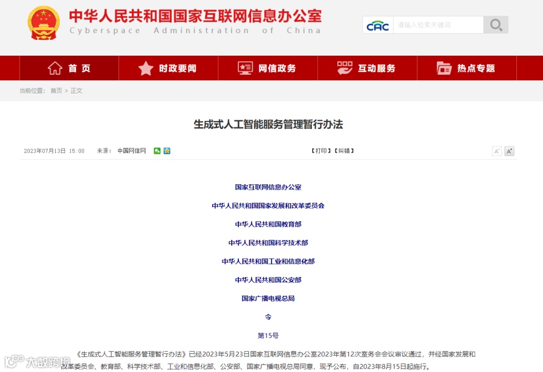 7月13日,国家网信办联合国家发展改革委、教育部、科技部、工业和信息化部、公安部、广电总局公布《生成式人工智能服务管理暂行办法》(以下称《办法》),自2023年8月15日起施行,成为国家首次针对于当下爆火的生成式人工智能(生成式AI,或AIGC)产业发布规范性政策。