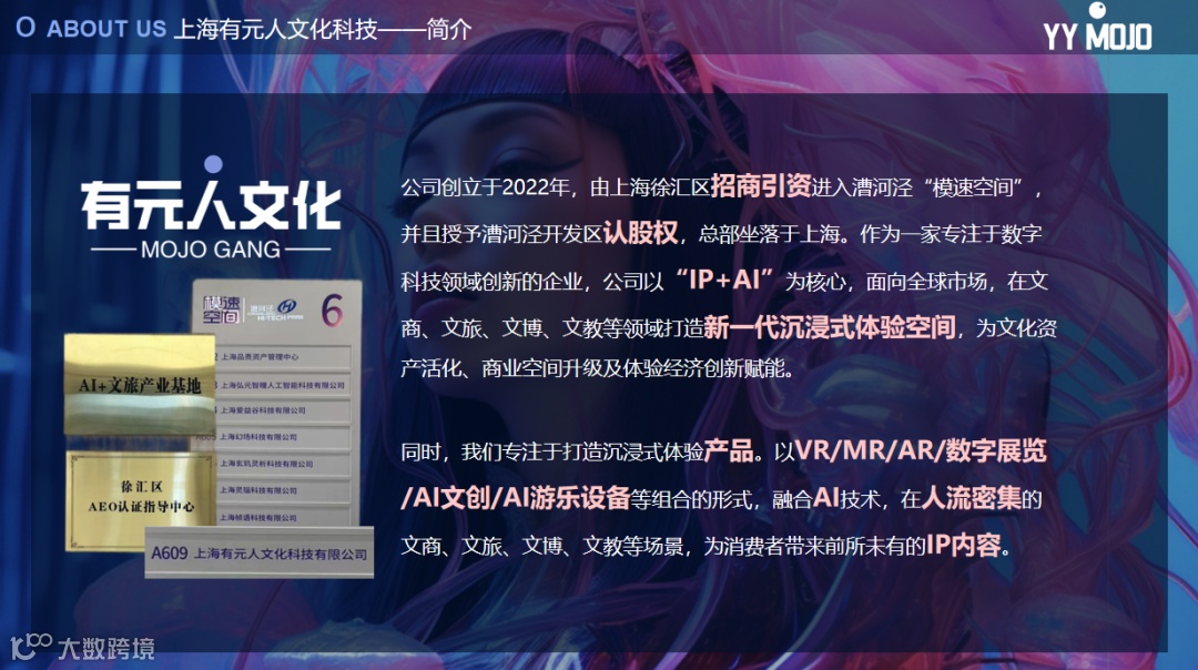 公司设立于2022年9月,是一家深耕 IP+AI的科创型企业,秉持“前沿科技+创意内容+商业策略=IP 智造”的理念,致力于将传统文化与现代科技相结合,打造新时代沉浸式交互体验空间,创造具有全球影响力的文化精品。